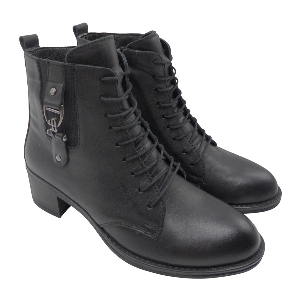 Un diseño elegante y versátil que se adapta a cualquier ocasión. Este botín está confeccionado en piel natural de alta calidad, con cierre de cremallera lateral que aporta comodidad al calzarlo y cordones decorativos adornados con una hebilla metalizada para un toque sofisticado y actual.