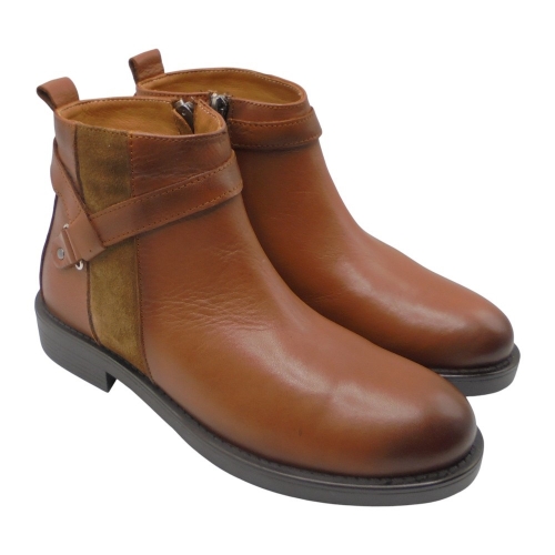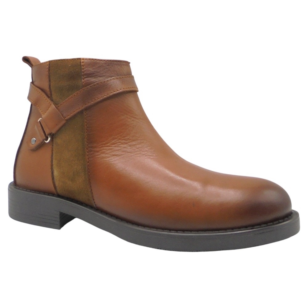 Un diseño elegante y versátil que se adapta a cualquier ocasión. Este botín está confeccionado en piel natural de alta calidad, con cierre de cremallera lateral que facilita el calce y un detalle distintivo en el lateral formado por dos tiras cruzadas con hebilla y un corte de serraje al tono, que aportan un toque sofisticado y actual.