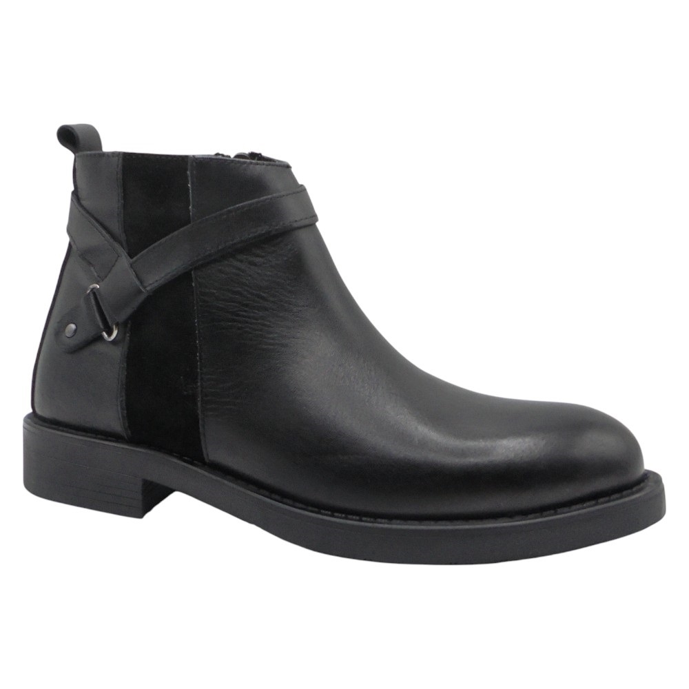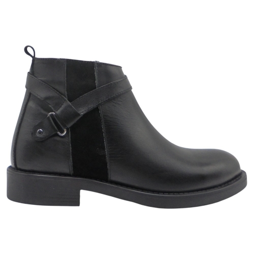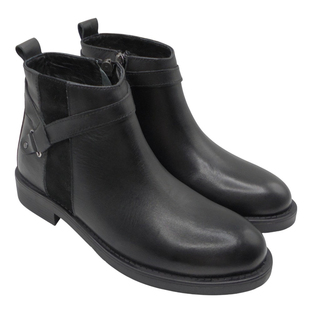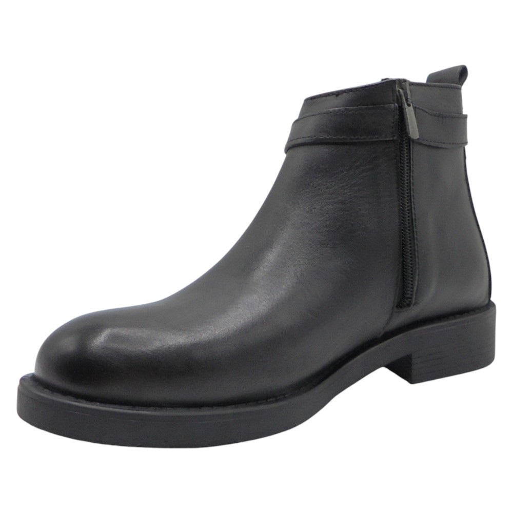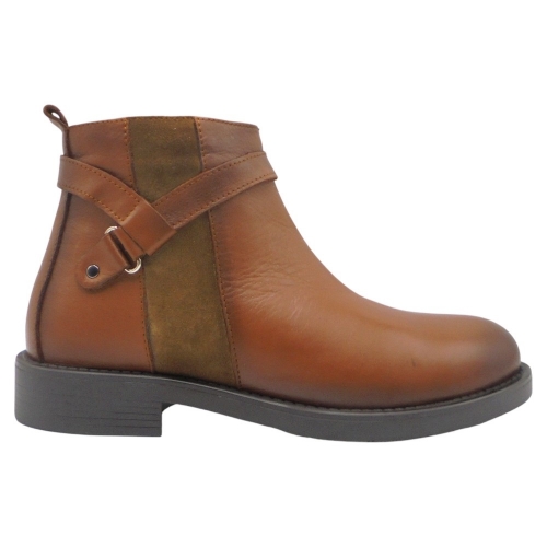 Un diseño elegante y versátil que se adapta a cualquier ocasión. Este botín está confeccionado en piel natural de alta calidad, con cierre de cremallera lateral que facilita el calce y un detalle distintivo en el lateral formado por dos tiras cruzadas con hebilla y un corte de serraje al tono, que aportan un toque sofisticado y actual.