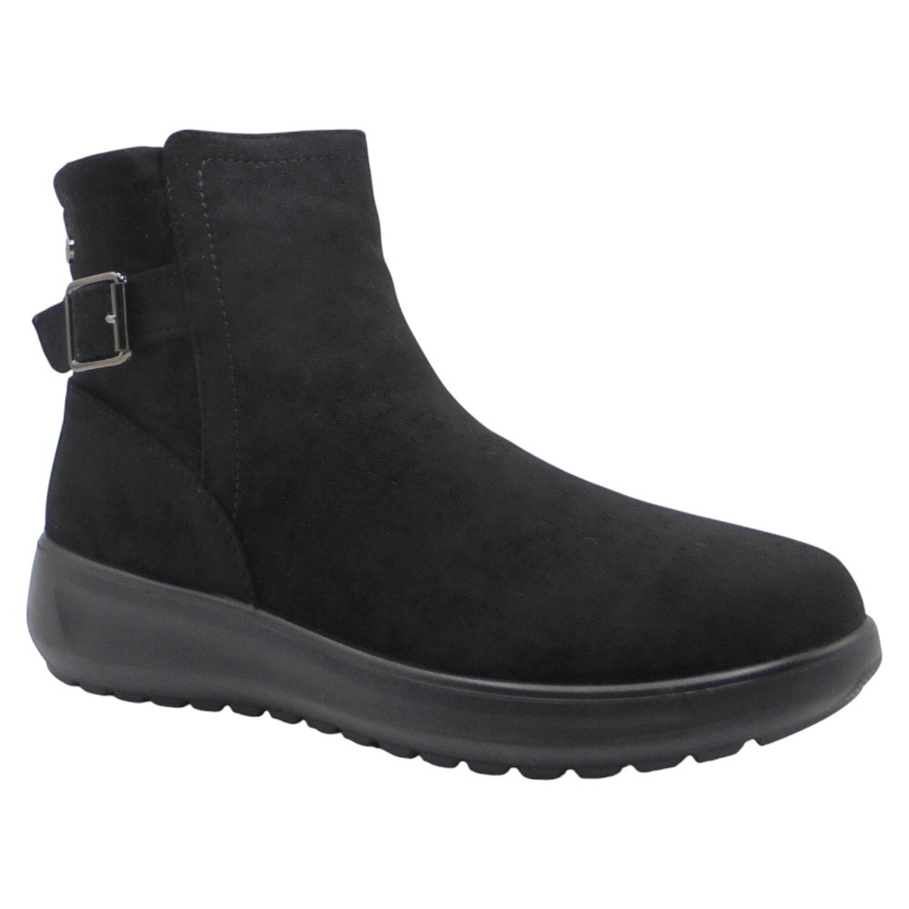 El diseño presenta un cierre con cremallera lateral que facilita el calce y una elegante hebilla decorativa en el lateral de la caña, aportando un toque moderno y sofisticado. También incluye un tirador trasero que mejora la practicidad al ponerse el calzado.