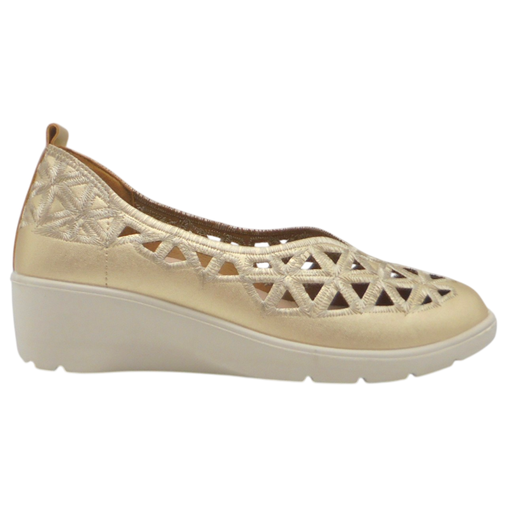 Estas manoletinas de cuña son la opción perfecta para mujeres que buscan un calzado cómodo, femenino y con un diseño especial que marque la diferencia. Su elegante pala calada y bordada aporta un toque delicado y sofisticado, ideal para complementar tanto looks casuales como más arreglados.