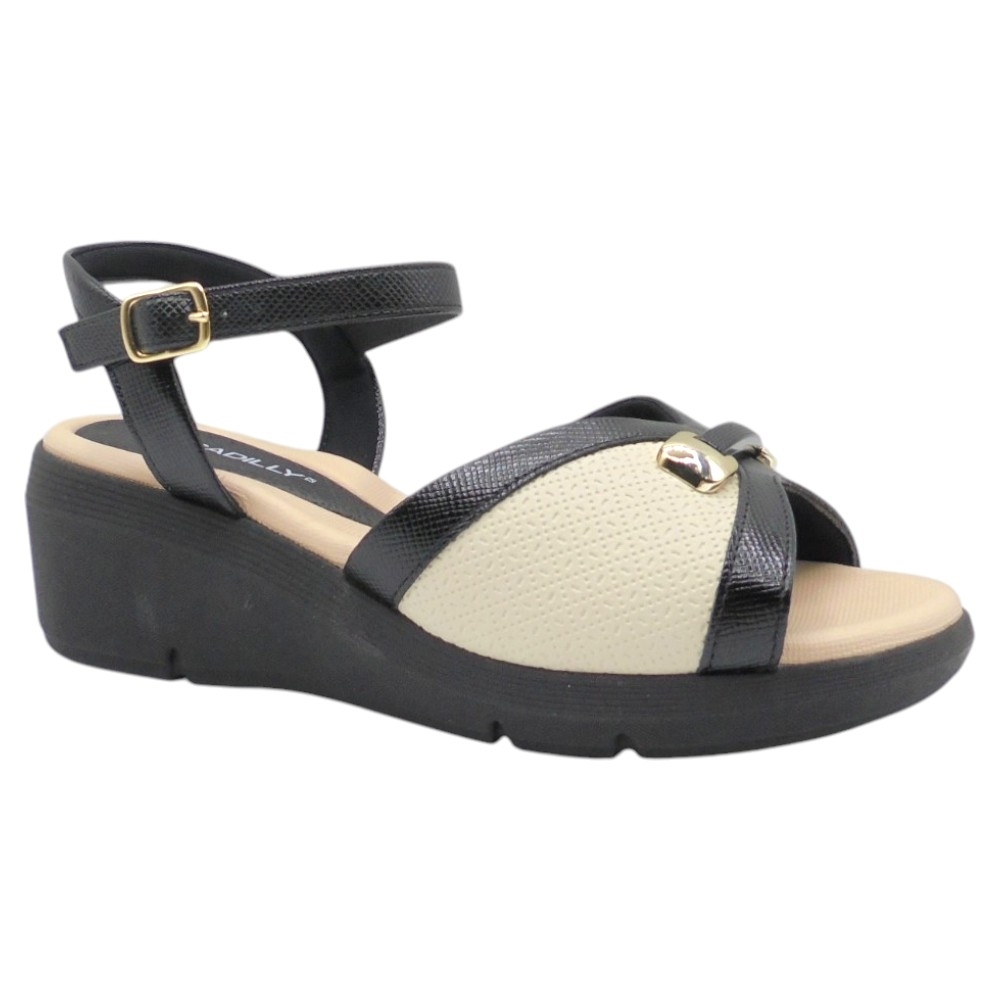 Fabricado en licra elástica, este modelo se ajusta delicadamente al contorno del pie, brindando una comodidad superior y facilitando el movimiento natural. Además, su adorno metálico en la pala aporta un toque sofisticado y elegante, ideal para complementar cualquier look. Su piso de cuña ultraligero de 5 cm de altura proporciona la elevación perfecta sin añadir peso, garantizando estabilidad y una pisada natural y sin esfuerzo.