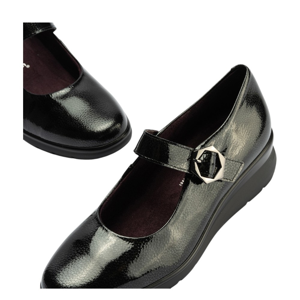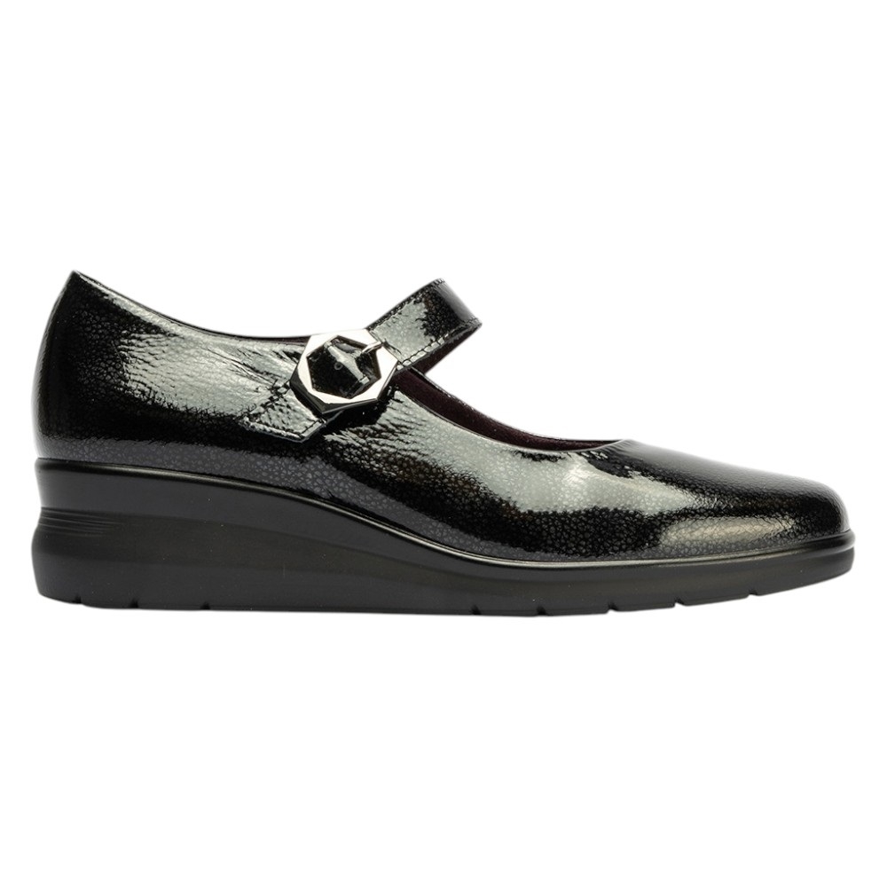 Fabricado íntegramente en piel acharolada de primera calidad en color negro, este zapato ofrece un acabado brillante y elegante que realza cualquier look. Su forro interior textil transpirable favorece la frescura, mientras que las plantillas extraíbles térmicas y superabsorbentes ayudan a combatir el sudor y los malos olores, garantizando confort durante toda la jornada.