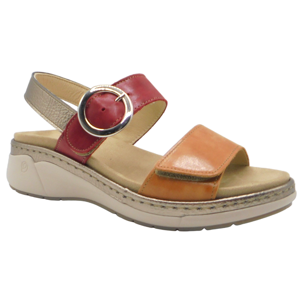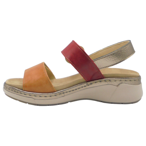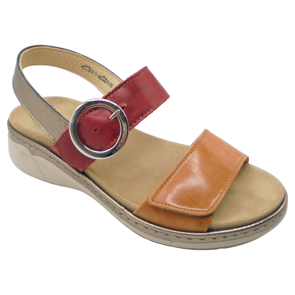 Sandalia de piel natural de primera calidad, diseñada para ofrecer confort y estilo. Cuenta con cierre de velcro tanto en la pala como en la parte trasera, lo que permite un ajuste fácil, cómodo y personalizado. La pala está elaborada completamente en piel natural, en tres tonos diferentes, lo que aporta un toque elegante y moderno. Como detalle distintivo, incorpora un adorno de hebilla lateral en la parte trasera que realza su diseño. Plantilla extraíble forrada en microfibra lavable, con velcro inferior que evita su deslizamiento. Forro interior de piel que garantiza transpirabilidad y confort durante todo el día. Suela de goma antideslizante y cuña de 4,5 cm que proporciona una pisada firme y estable.