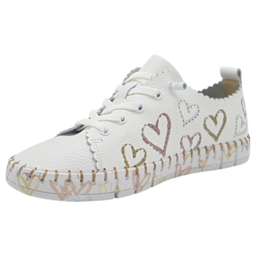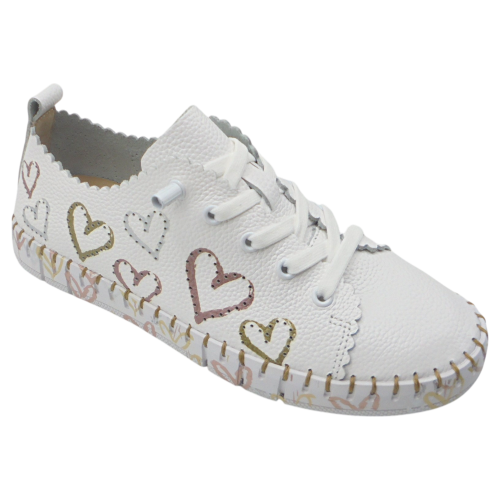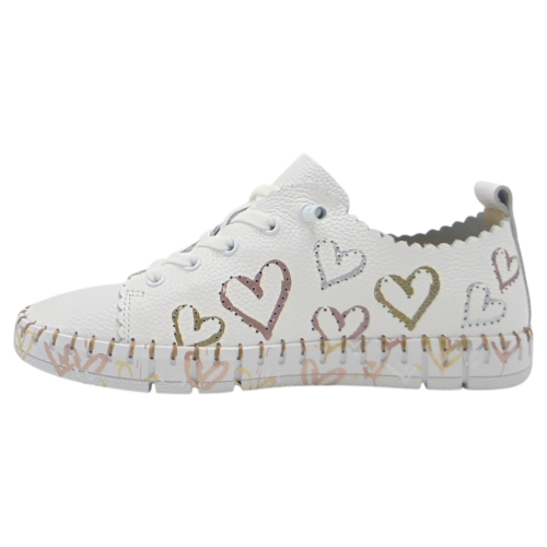 La The Happy Monk modelo Creta 030 es una zapatilla plana para mujer que combina comodidad, calidad y un diseño original y alegre. Confeccionada en piel suave de color blanco, destaca por sus corazones troquelados en diferentes colores, que aportan un toque distintivo y divertido a su estilo casual.