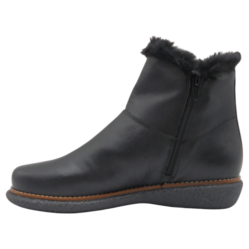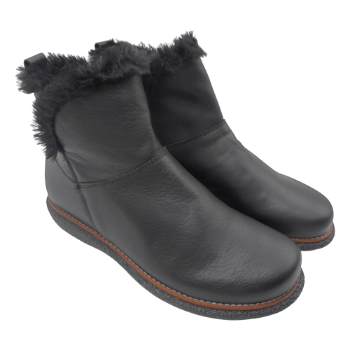 Su cuña de 2,5 cm aporta una ligera elevación y gran estabilidad, mientras que el piso de goma termoplástica antideslizante, cosido a la suela, garantiza una excelente resistencia y agarre. Como detalle distintivo, el adorno de pelo en la parte alta de la caña añade un toque cálido, invernal y elegante.