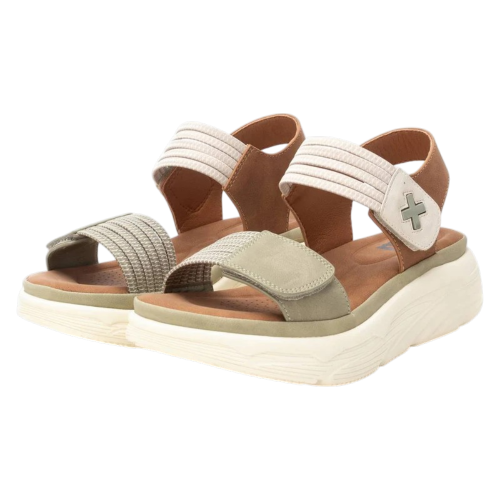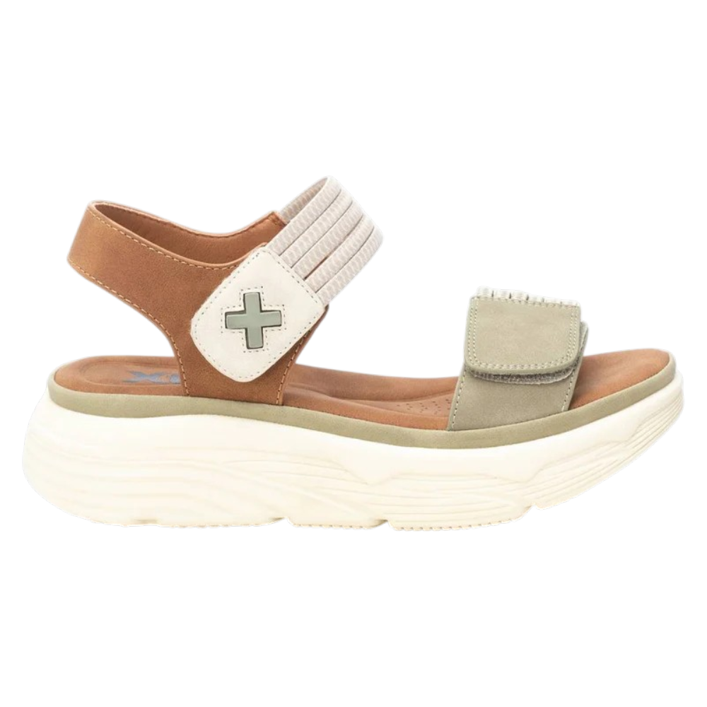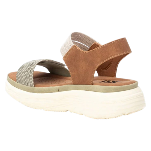 Sandalia de mujer de la marca Xti, modelo 143986, diseñada para ofrecer estilo y comodidad en el día a día. Está fabricada en un material que imita la piel, combinado con tiras elásticas en el tobillo que aportan un ajuste perfecto y mayor sujeción. Cuenta con cierre adhesivo, lo que facilita un calce rápido y práctico.