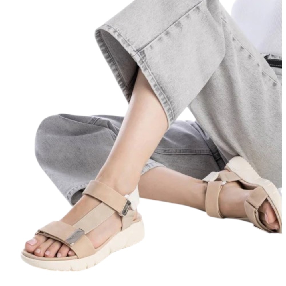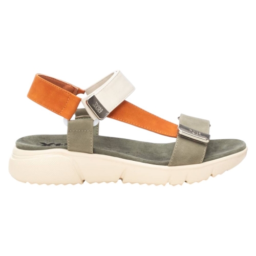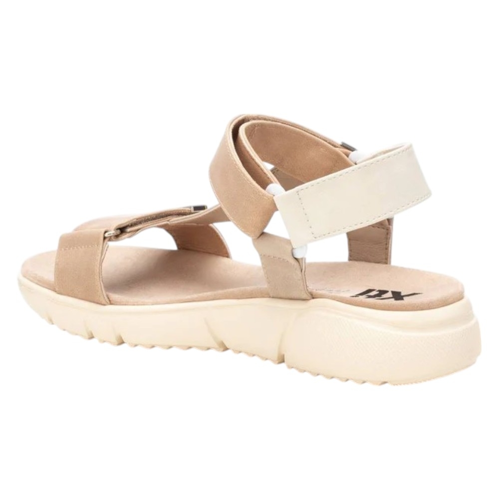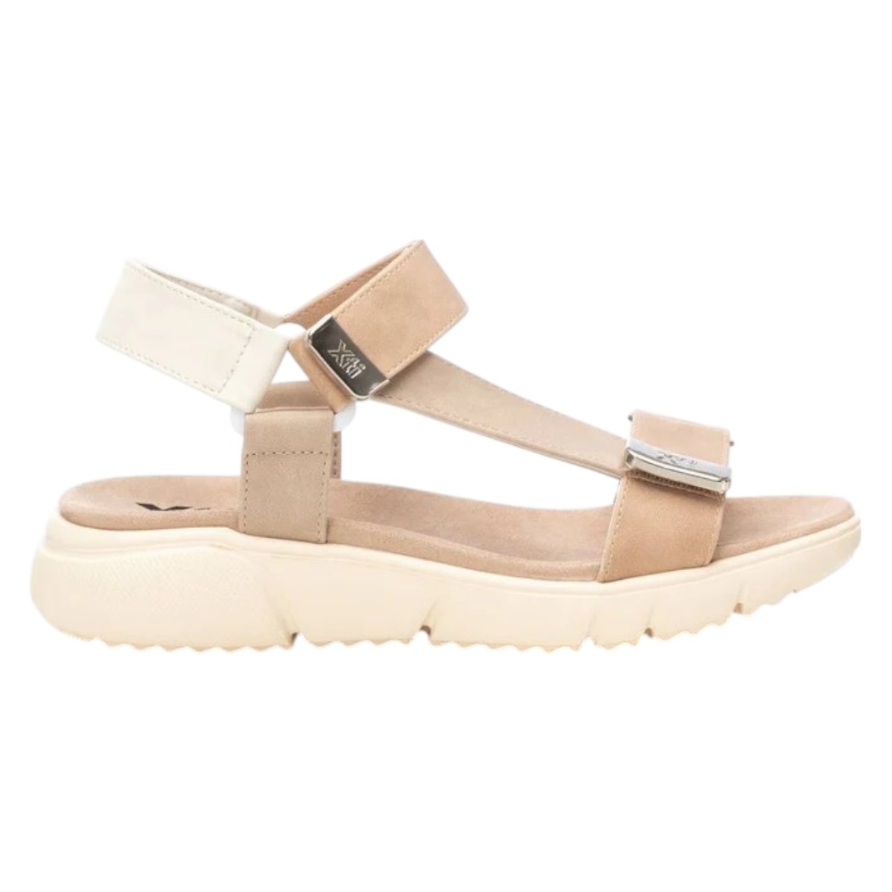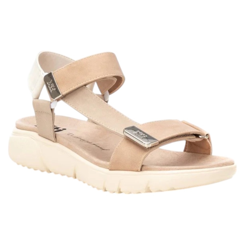 La sandalia negra de mujer Xti modelo 144112 destaca por su diseño moderno y funcional. Fabricada en material que imita la piel, es una opción perfecta para quienes buscan comodidad y estilo. Su modelo de tiras se adorna con un detalle metálico que le da un toque sofisticado y atractivo. El cierre es mediante cierre adhesivo, lo que facilita su ajuste y uso diario. La suela deportiva ofrece una amortiguación excelente, mientras que su característica antideslizante proporciona seguridad al caminar. Ideal para complementar un look casual pero elegante, esta sandalia asegura confort y estabilidad en todo momento