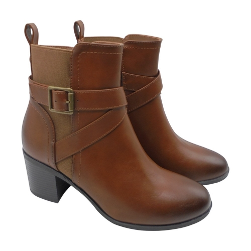 Confeccionado en piel sintética de alta calidad, este modelo se distingue por su adorno lateral con una hebilla que rodea el tobillo, aportando un detalle elegante y contemporáneo que realza su estilo femenino.