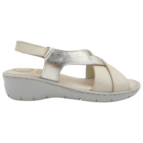 Se trata de una sandalia de cuña, fabricada en piel muy suave, con forro también en piel, lo que garantiza una sensación agradable y transpirable durante todo el uso. Su diseño presenta la puntera abierta y una pala compuesta por elegantes tiras cruzadas en dos tonos, que aportan un estilo moderno y dinámico.