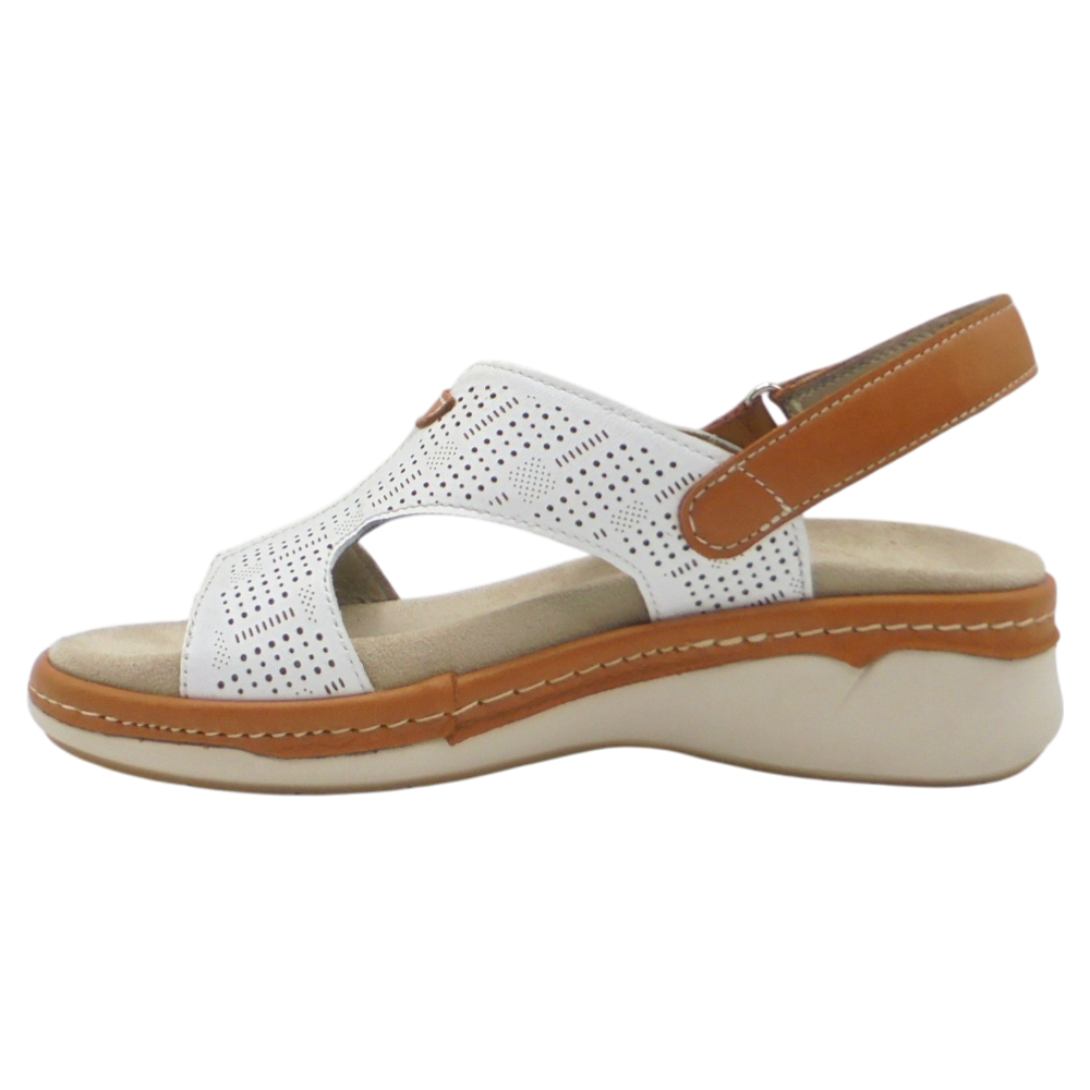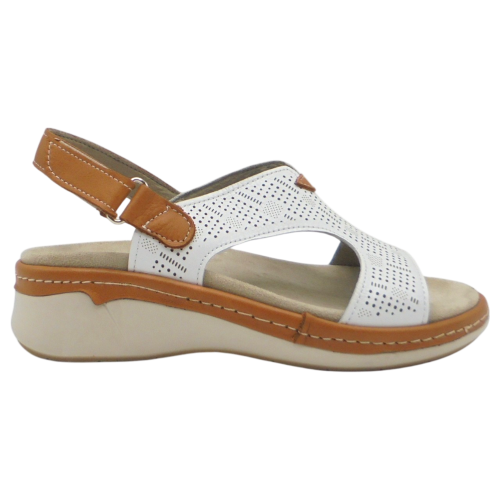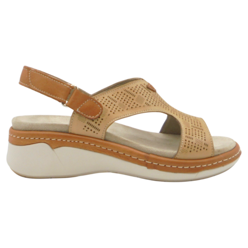 Se trata de una sandalia de cuña, fabricada en piel muy suave, con forro también en piel, lo que garantiza una sensación agradable y transpirable durante todo el uso. Su diseño presenta la puntera abierta y una pala elegante grabada al láser, que aporta un toque moderno y distintivo.