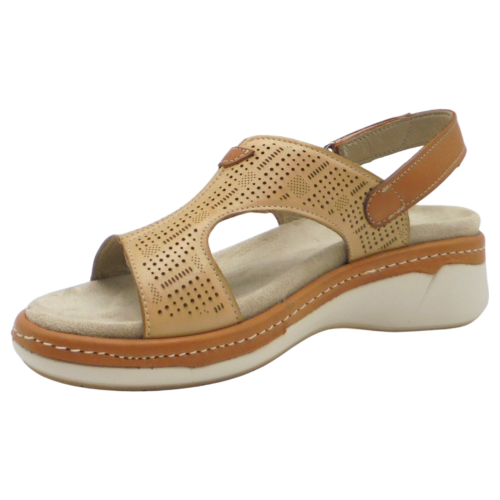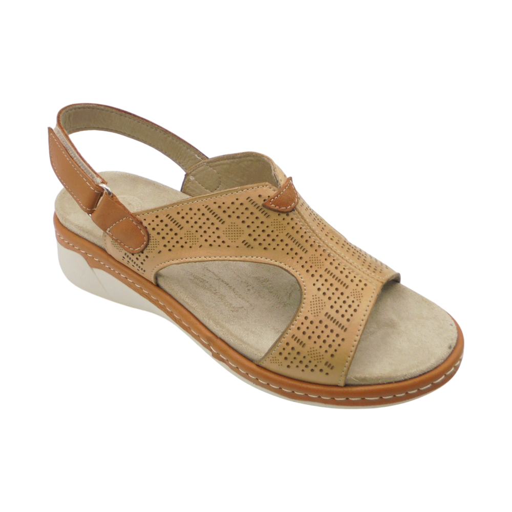 Se trata de una sandalia de cuña, fabricada en piel muy suave, con forro también en piel, lo que garantiza una sensación agradable y transpirable durante todo el uso. Su diseño presenta la puntera abierta y una pala elegante grabada al láser, que aporta un toque moderno y distintivo.