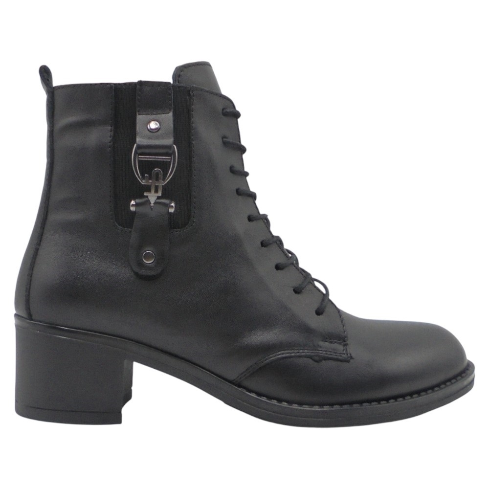 Un diseño elegante y versátil que se adapta a cualquier ocasión. Este botín está confeccionado en piel natural de alta calidad, con cierre de cremallera lateral que aporta comodidad al calzarlo y cordones decorativos adornados con una hebilla metalizada para un toque sofisticado y actual.