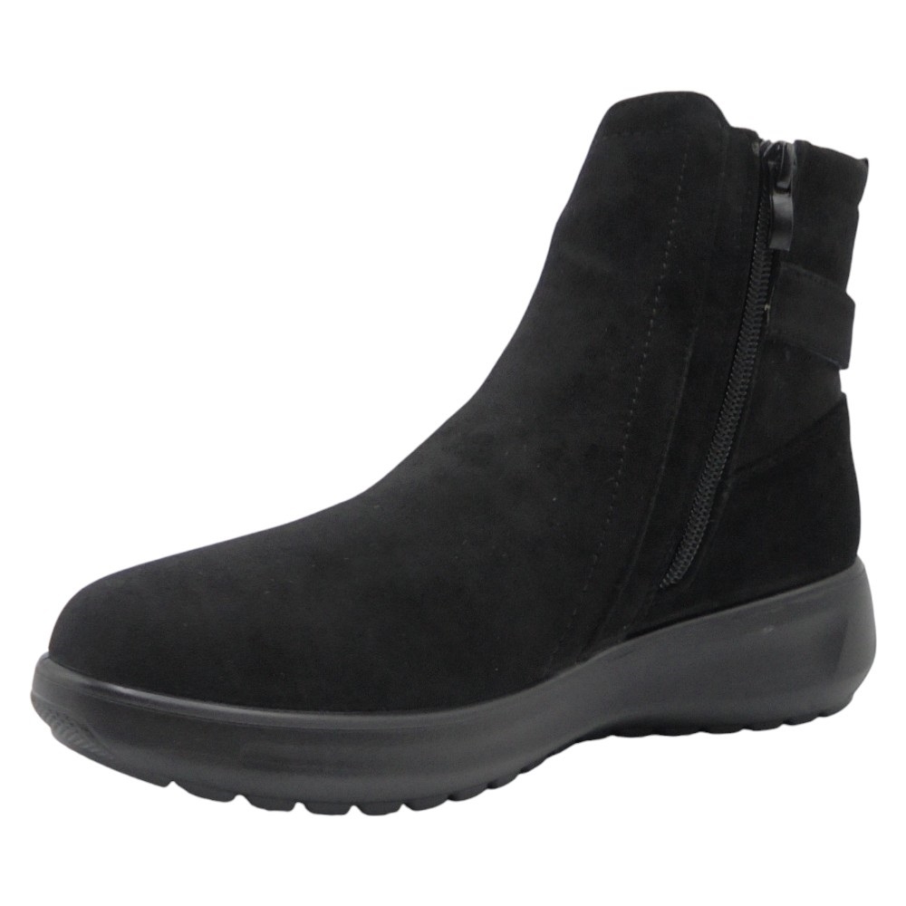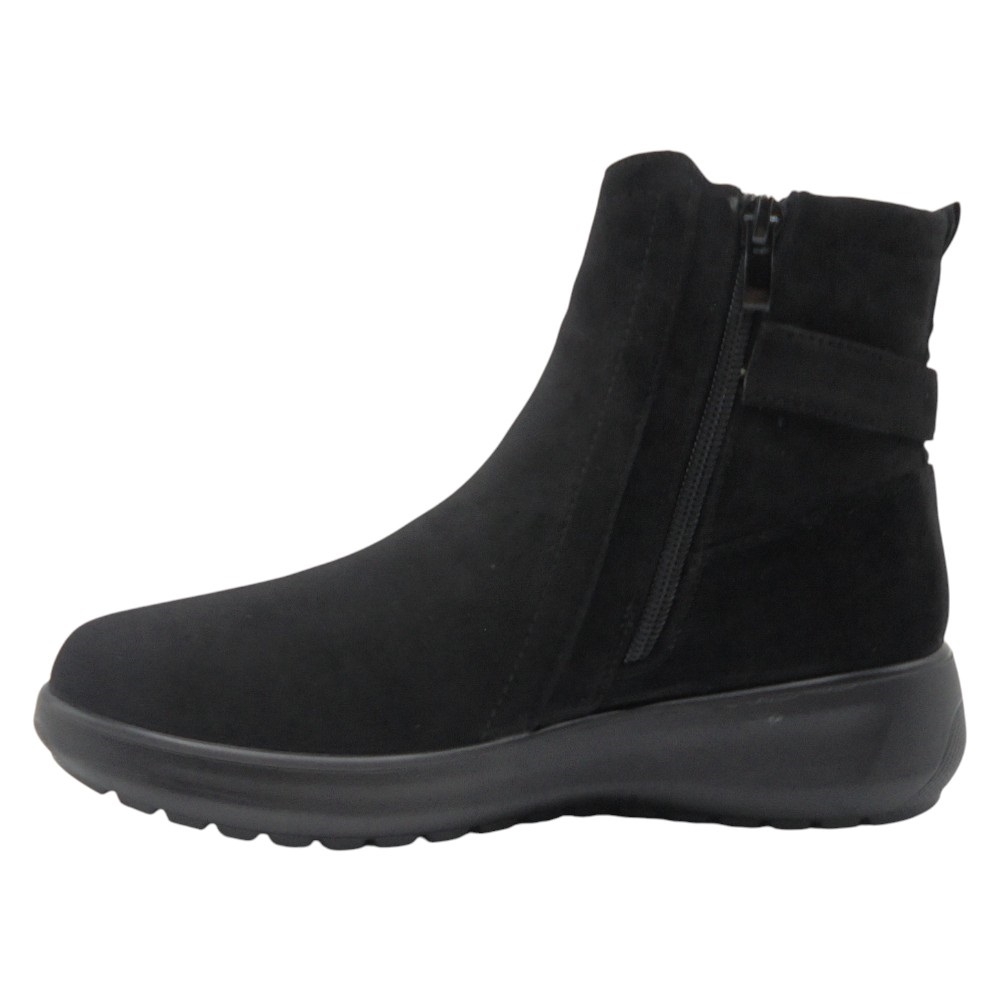 El diseño presenta un cierre con cremallera lateral que facilita el calce y una elegante hebilla decorativa en el lateral de la caña, aportando un toque moderno y sofisticado. También incluye un tirador trasero que mejora la practicidad al ponerse el calzado.