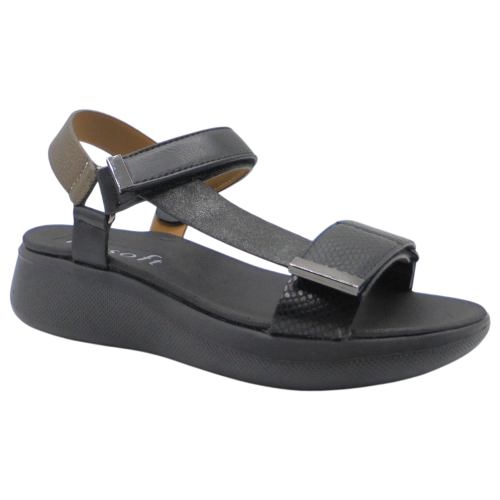 Sandalia de cuña de la marca Mysoft, modelo 26M364, diseñada para ofrecer comodidad y estilo en el día a día. Presenta una cuña de 4 cm que proporciona una ligera elevación sin renunciar al confort. Su diseño está compuesto por tiras en dos tonos, aportando un toque moderno y versátil.