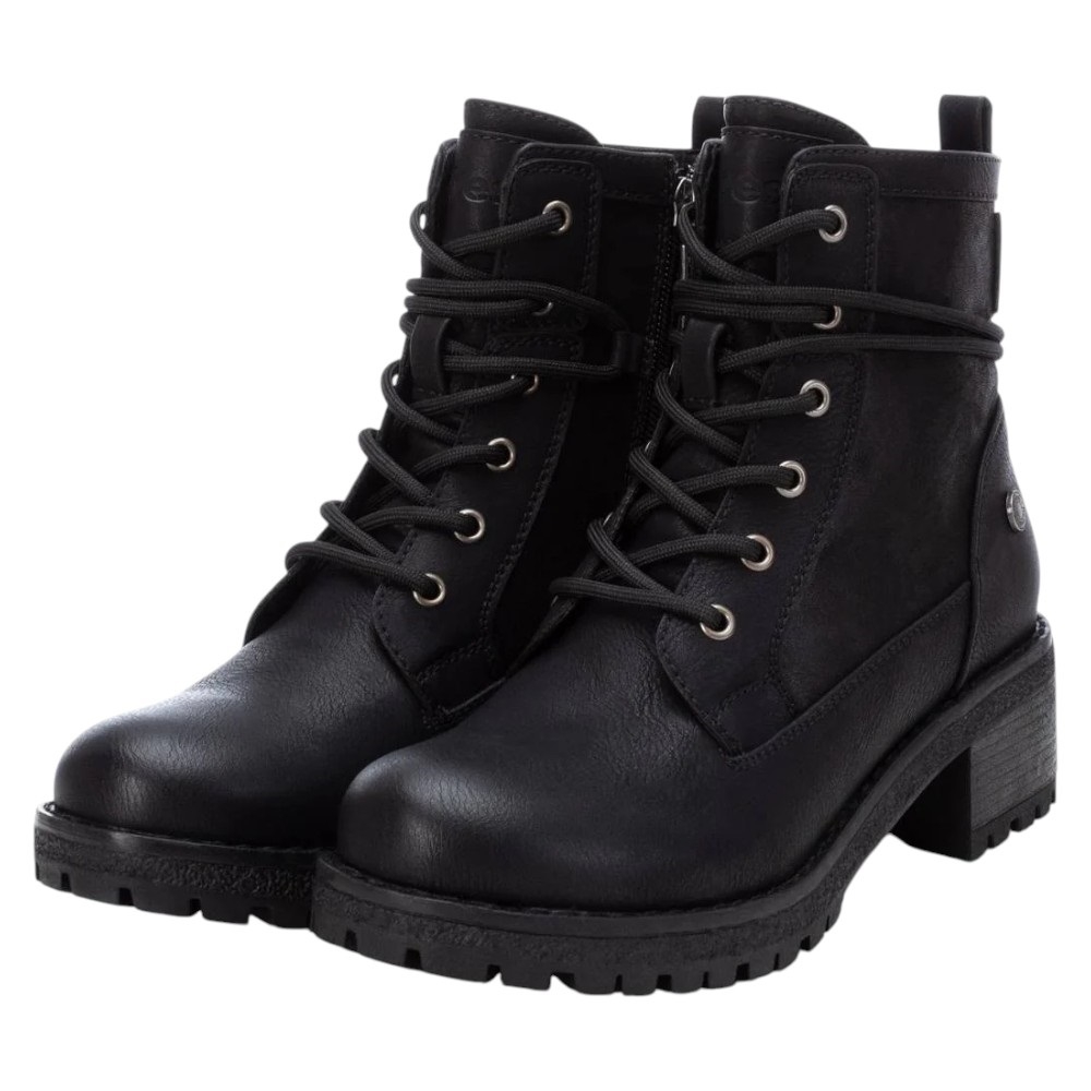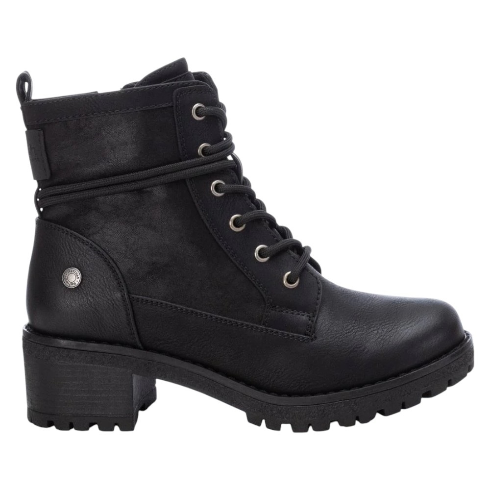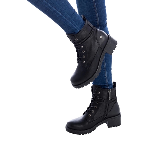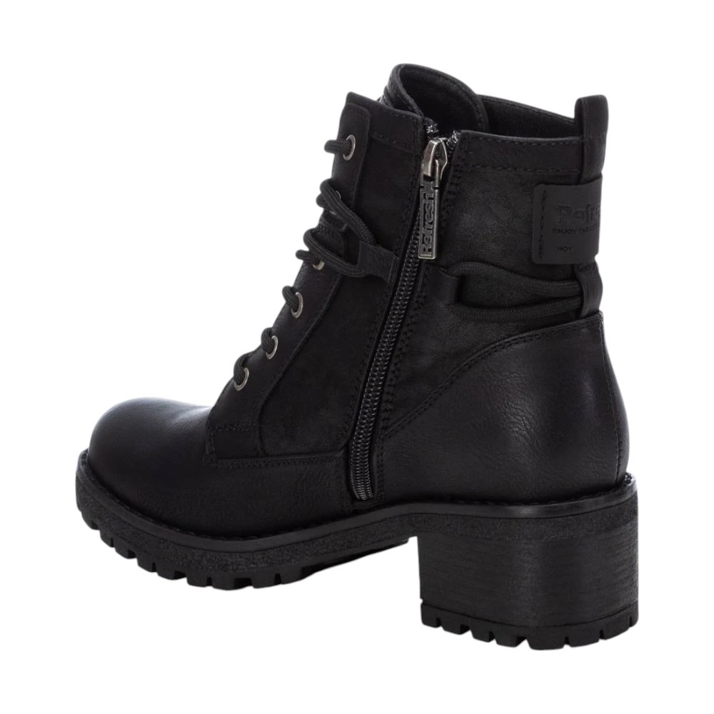 Refresh 170145 – Botín estilo militar de mujer con un diseño moderno y versátil. Está confeccionado en material que imita la piel, ofreciendo resistencia y un acabado elegante. Incorpora cremallera lateral y tirador trasero para un calce rápido y cómodo, además de cordones ajustables alrededor del tobillo, que aportan un toque en tendencia y personalizable.