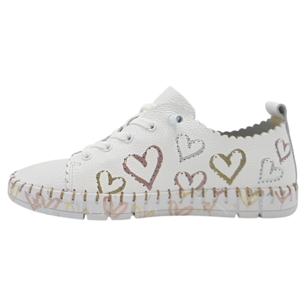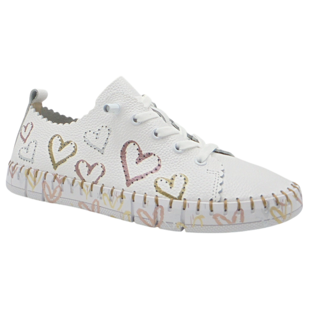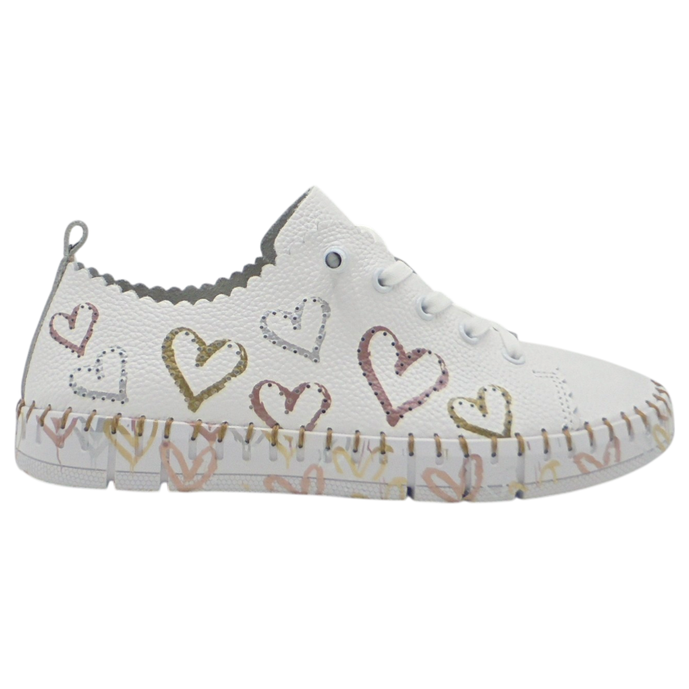 La The Happy Monk modelo Creta 030 es una zapatilla plana para mujer que combina comodidad, calidad y un diseño original y alegre. Confeccionada en piel suave de color blanco, destaca por sus corazones troquelados en diferentes colores, que aportan un toque distintivo y divertido a su estilo casual.