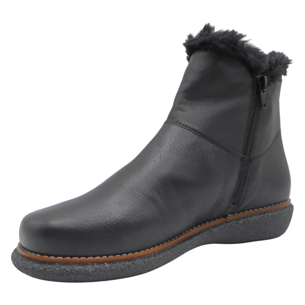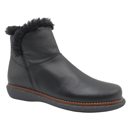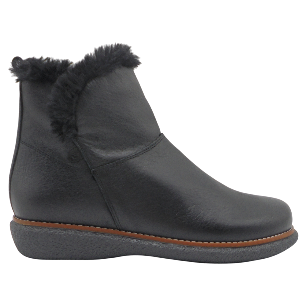 Su cuña de 2,5 cm aporta una ligera elevación y gran estabilidad, mientras que el piso de goma termoplástica antideslizante, cosido a la suela, garantiza una excelente resistencia y agarre. Como detalle distintivo, el adorno de pelo en la parte alta de la caña añade un toque cálido, invernal y elegante.